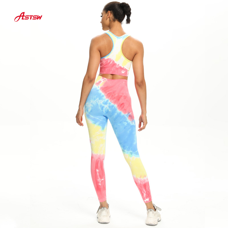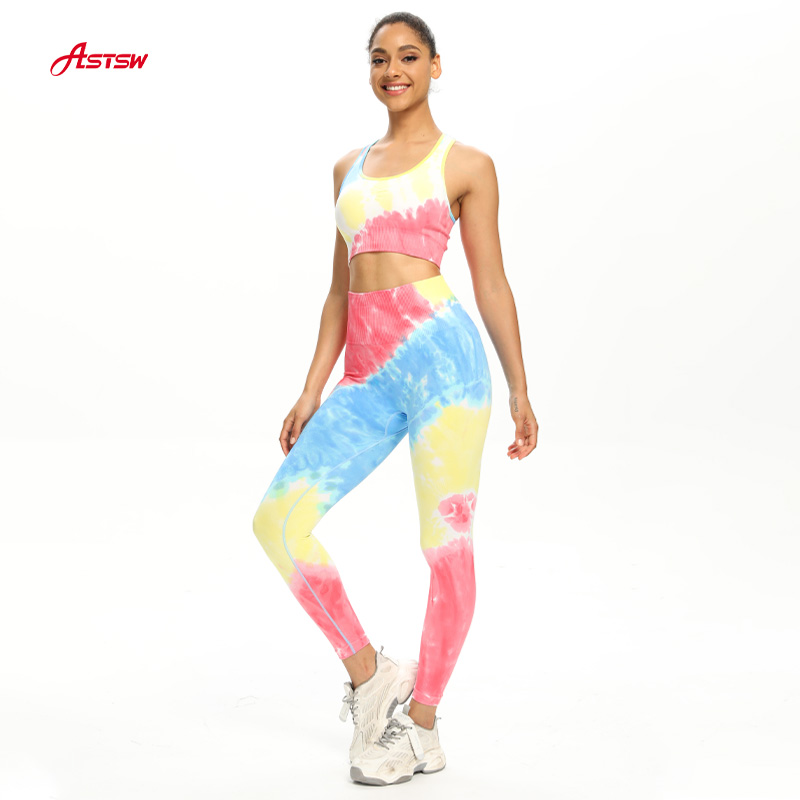 جمع الملابس الرياضية غير الملحومة. هذا حمالة الصدر الرياضية غير الملحومة ذات الظهر المتسابق والسراويل الضيقة عالية الارتفاع زاهى الألوان نمط التعادل صبغ.